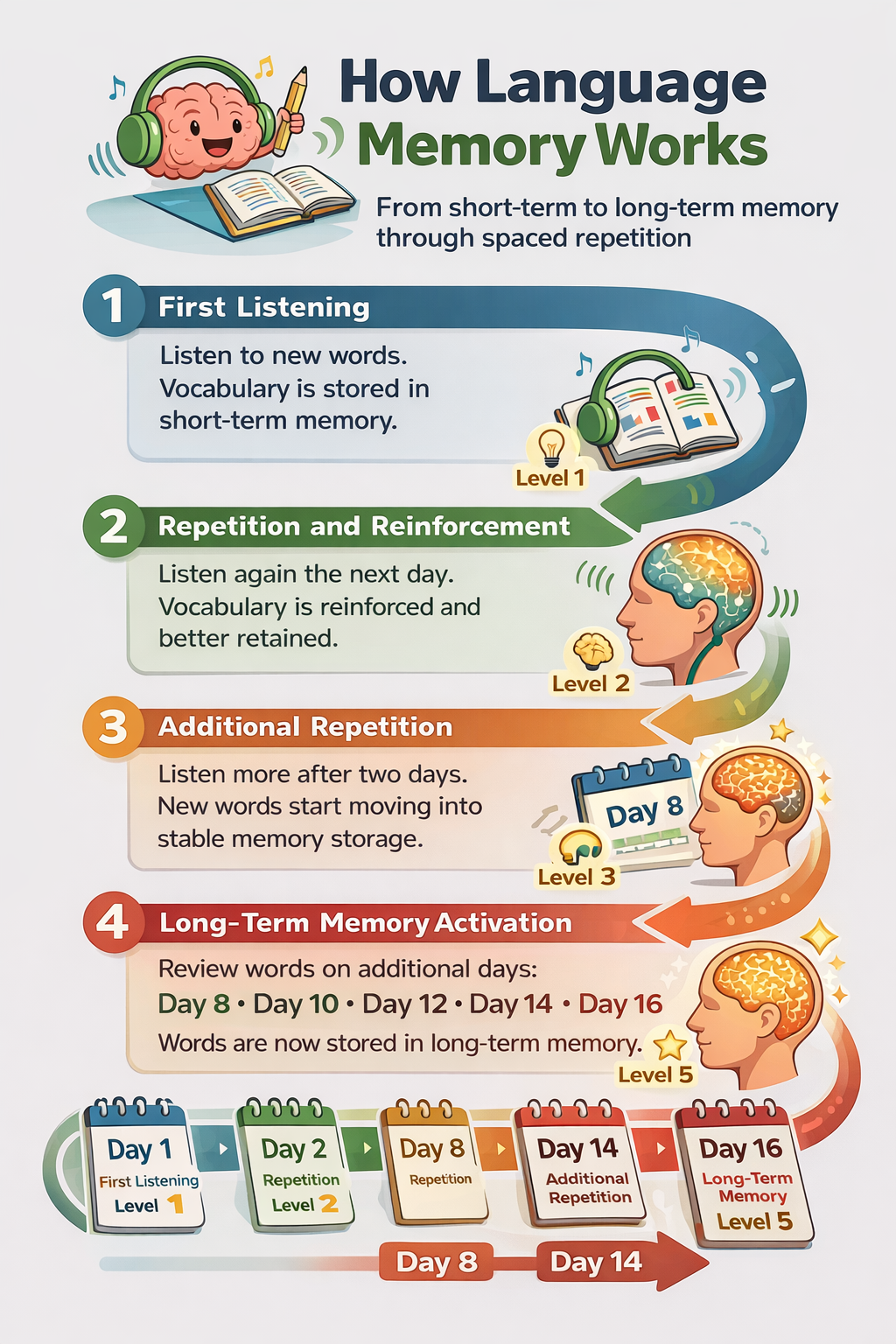 Instead of learning words once and forgetting them, the system introduces vocabulary and then reinforces it through planned repetition over several days.